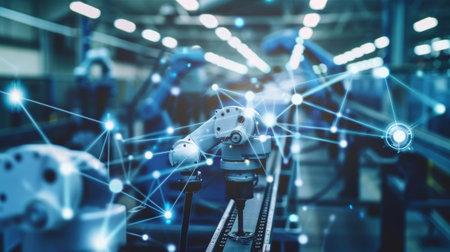 Advanced robotic arms operate on an automated assembly line in a modern manufacturing facility