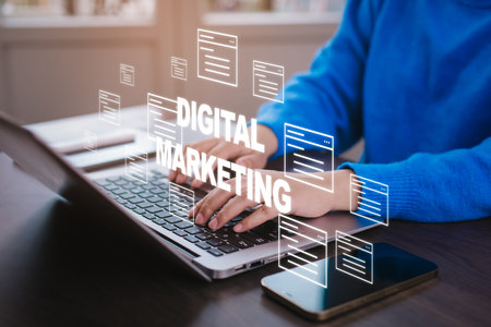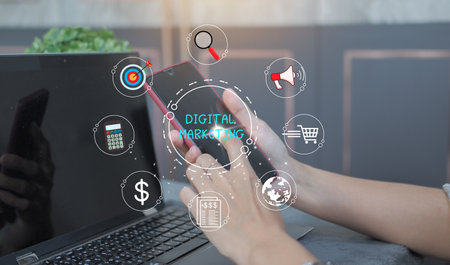 A businessman is using a laptop to create digital marketing content.Creating marketing strategies involves sharing information to attract customer interest.Online marketing and digital marketing.
