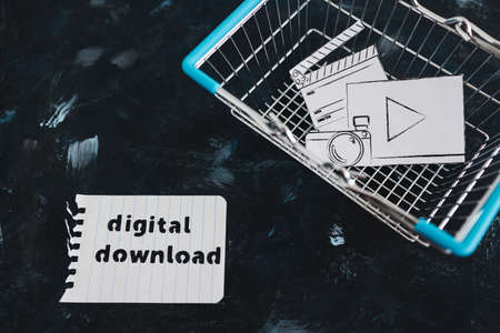 creative content sold online conceptual image, photo and video digital downloads icon in shopping basket