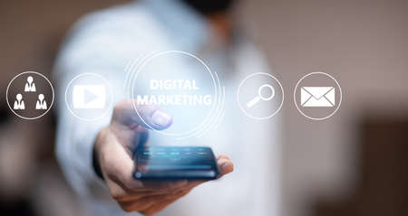 Hand with smartphone and app digital marketing.