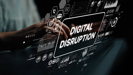 Hands Typing on Keyboard with Digital Disruption Concept and Technology Graphics Representing Innovation and Change in Business. Asymptotic smart data analytic.