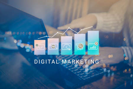 Person using a laptop computer with dIgital marketing technology concept. new startup project online search engine optimisation.