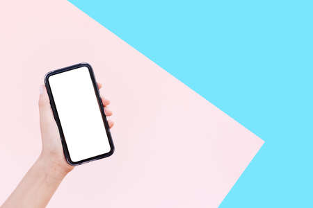 Close-up of female hand holding smartphone with mockup on backgrounds of pastel pink and blue colors with copy space.