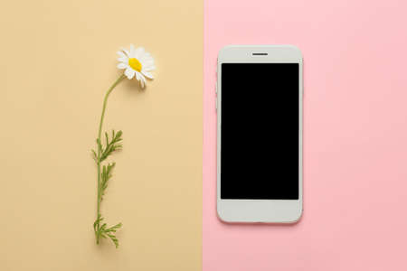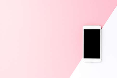 Overhead shot of white mobile phone with blank screen on abstract background with copyspace. Flat lay