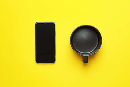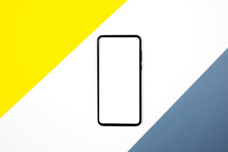 Blank screen cellphone on diagonal pastel yellow and blue background.