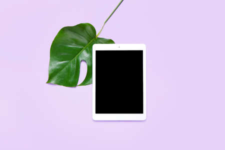 Top view, Tablet touchpad empty screen mockup with stylus pen and palm leave on green background.