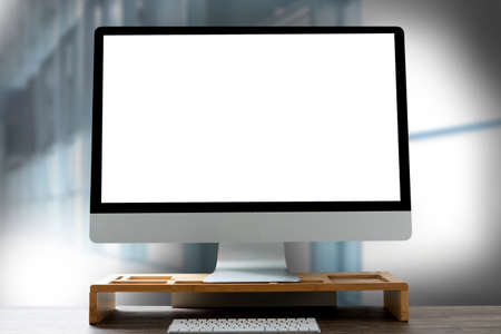 Blurred view of a desk with computer in a modern home interior. Out of focus big monitor on the table ready to work or study in a remote station. Home working, homeschooling, new technology concept.