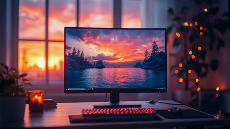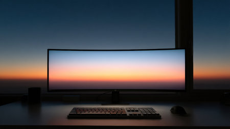 A sleek desk showcases a wide monitor and a keyboard, while a beautiful gradient sky in soft colors enhances the peaceful ambiance at dusk.