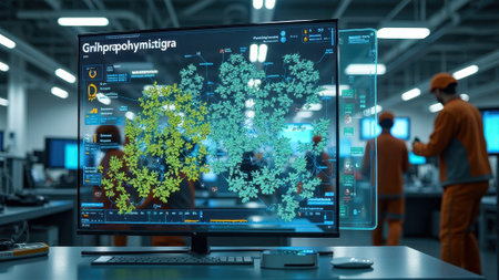 Advanced data analysis in modern industrial facility with interactive display. That the image is generated using AI.