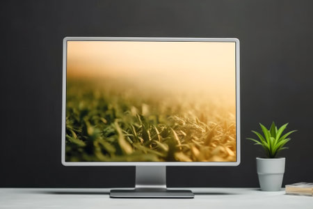 A mock-up of a white monitor and a cup on a white table. Pastel green background. Minimalistic interior. Landscape with green fresh leaves on the device screen. Stylish workplace. Generated by AI.