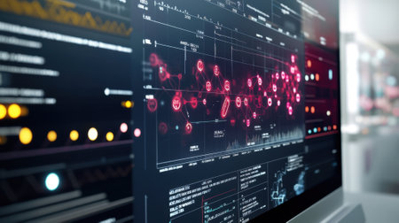 High-resolution image of a sleek data dashboard on a computer monitor showcasing financial analysis with various statistical graphs and trends.