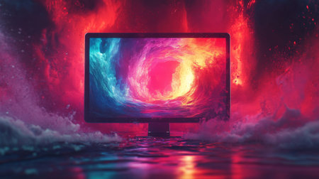 Computer screen showing a colorful abstract vortex emerging from water surface