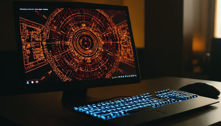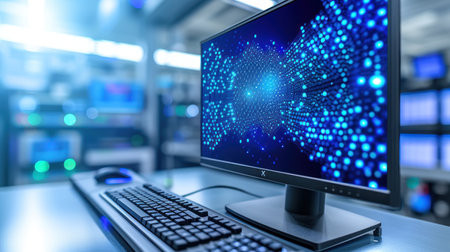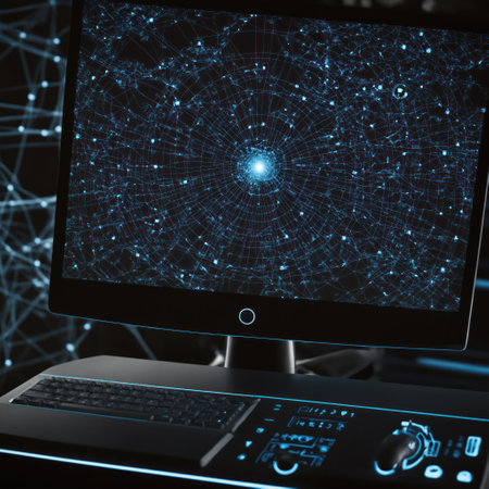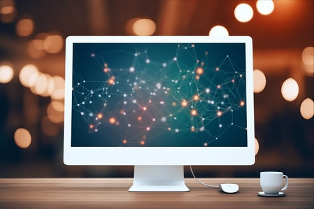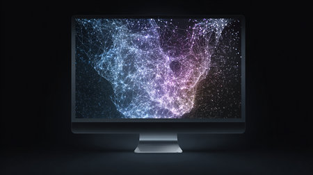 A modern computer monitor displays a captivating digital network visualization, illustrating complex connections and data flow within a dark workspace environment.