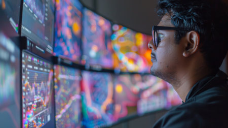 An Individual Analyzes Financial Market Data on Multiple Screens in a Modern Trading Room Environment During Late Afternoon Hours. Generative AI