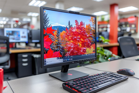 A modern professional workspace showcasing a desktop computer with colorful data visualizations on the screen. Ideal for business, finance, and analysis themes.