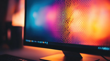 Bright and vibrant data visualizations fill the screen of a sleek computer in a contemporary office setting.