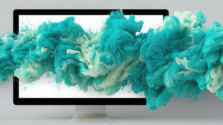 A stunning visual of vibrant turquoise and green swirls erupting from a computer screen, emphasizing creativity and modern technology in artistic design.