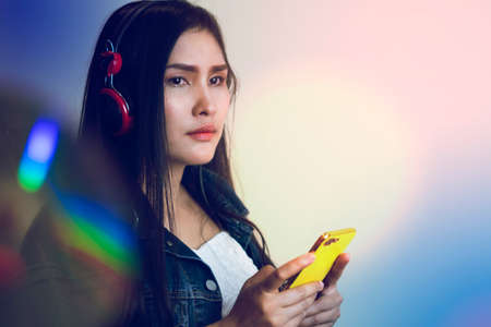 Asian woman wearing headphones listening to music from smartphone, sad mood concept.