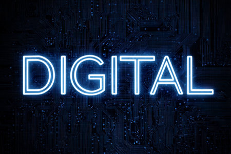 Features a neon-lit DIGITAL word over an abstract electronic circuit pattern that presents a technological theme against a dark, cool-toned color palette.