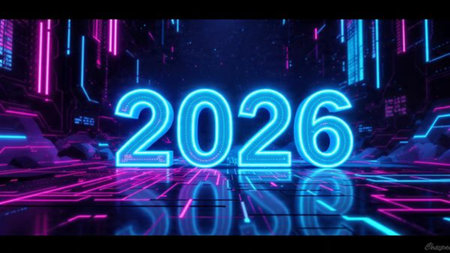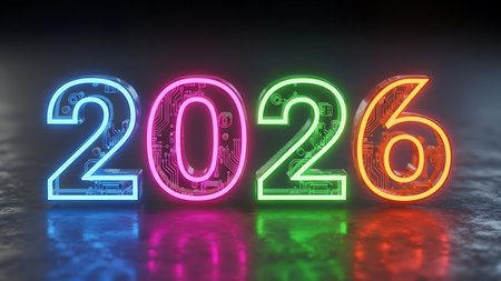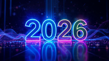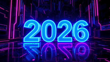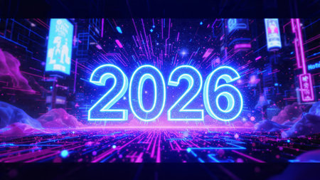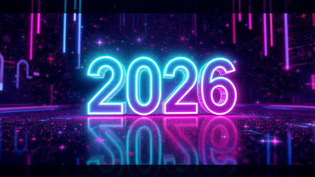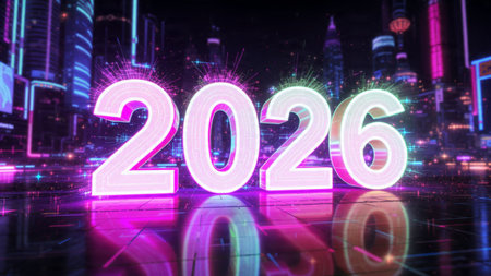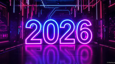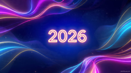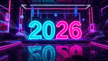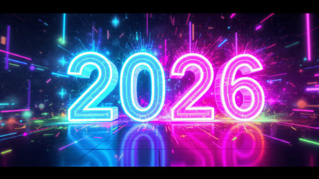 Neon numbers 2026 glowing in vibrant colors, creating futuristic and energetic atmosphere. bright hues of blue and pink evoke excitement and anticipation for upcoming year