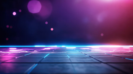 A vibrant, futuristic stage illuminated by neon lights and bokeh, creating a captivating visual experience.
