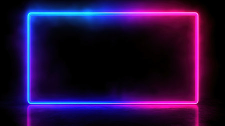 A vibrant neon rectangle frame against a black background. The frame is outlined with vibrant shades of blue and pink neon light, creating a visually striking and futuristic design. The reflection of the frame on the dark surface below adds depth and impact.