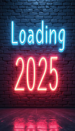 A striking neon sign illuminates the phrase Loading 2025 in vibrant blue and pink hues, set against a textured dark brick wall. This modern and energetic image captures the anticipation of the upcoming year, blending technology with a festive atmosphere.