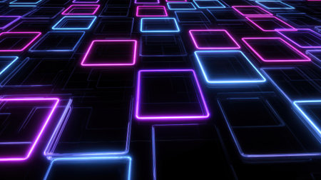 This abstract design presents glowing neon shapes against a dark background. The composition features squares with rounded corners, outlined with vibrant blue, pink, and purple colors. This graphic illustration can be used for various purposes, including website backgrounds, digital art, or commercial design applications.