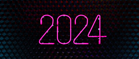 2024 neon sign with lights party. 3d, rendering, illustration,