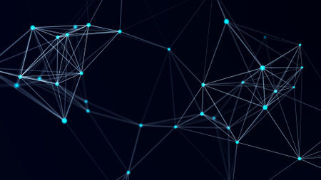 Abstract 3D network of glowing nodes and connecting lines on a dark background. Clear details and vibrant colo...