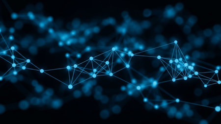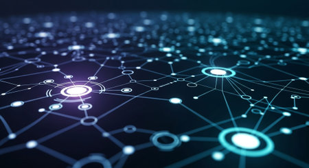 This image illustrates an abstract network of blue nodes and connecting lines against a dark background, symbolizing connectivity and advanced technology.