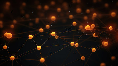 An abstract image showcases a network of interconnected nodes. The nodes have a warm, golden color, linked by lines that suggest connectivity. The composition is set against a dark background, and the lighting creates a sense of depth and dimension, suitable for technology or business applications.