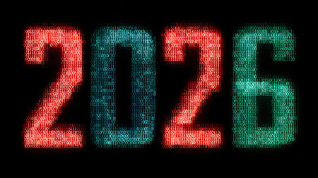 A vibrant digital representation of the year 2026, featuring glowing numbers infused with binary code on a dark background, symbolizing future technology and innovation.