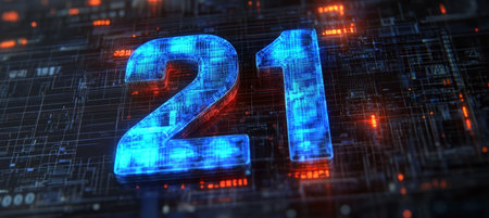 Glowing blue 3D number 21 on a digital circuit board background with a futuristic theme.