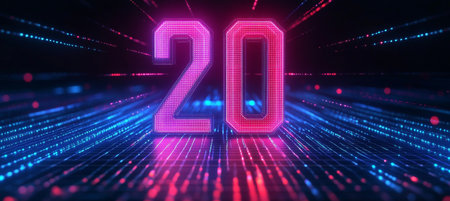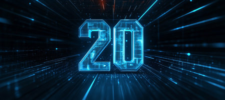 Glowing Digital Number 20 on a Sci-Fi Abstract Technology Background, Celebrating a 20th Anniversary