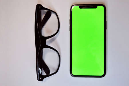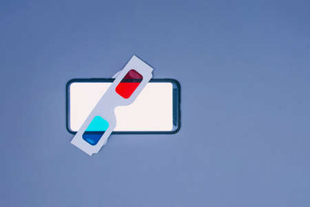 3D glasses with smartphone mockup with white screen on gray background. Glasses for watching videos in 3D