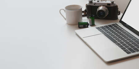 Cropped shot of minimal workspace with laptop computer and camera on white table table and coffee cup