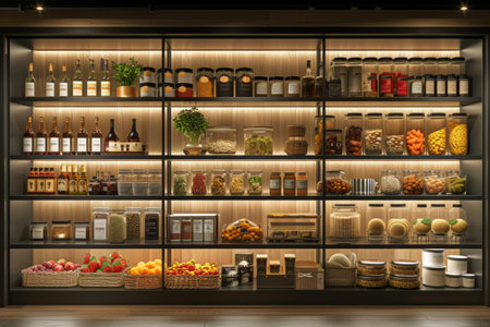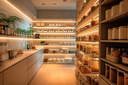 A well-organized kitchen with neatly arranged pantry items, clean countertops, and stylish storage solutions, emphasizing practical and aesthetic design.