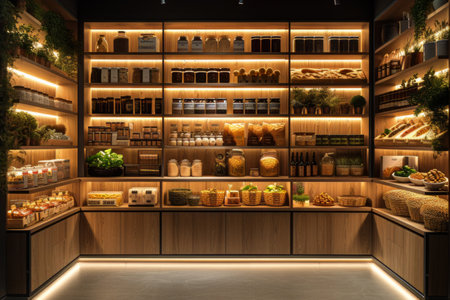 Well-organized grocery shelf filled with a variety of food products including jars, bottles, and packages. The warm wooden background adds a rustic and homely feel, ideal for food retail and kitchen concepts.