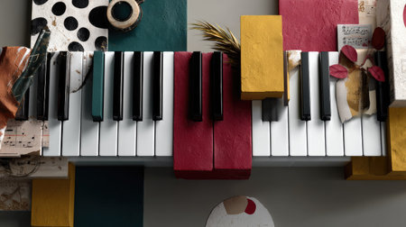 A vibrant flat lay art composition featuring piano keys surrounded by colorful geometric shapes, perfect for illustrating creativity and musical themes.