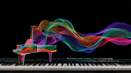 An illustration depicts a grand piano with vibrant, multi-colored waves emanating from it. The artwork features a black background, contrasting with the bright hues of the piano and waves. The style appears digital, suitable for various creative projects and potential commercial applications such as music-related content or design elements.