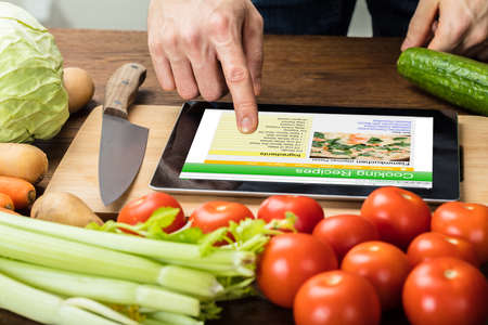 Close-up Of A Person Is Preparing Recipe Using Digital Tablet With Vegetables On Table