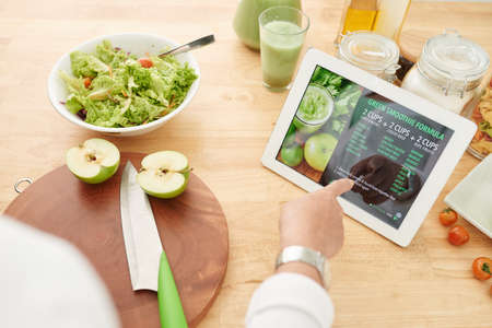 High angle close-up shot of unrecognizable woman holding digital tablet in hands reading smoothie recipe in Internet