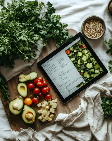 A healthy meal nutrition dashboard tablet food analytics diet tracker kitchen fresh tomato carrot herbs calories chart blend flavors with data