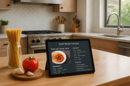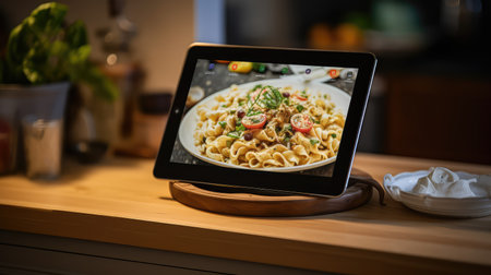 Smart kitchen recipe assistant displaying pasta with tomato sauce recipe on digital tablet with raw ingredients nearby, showcasing modern cooking technology