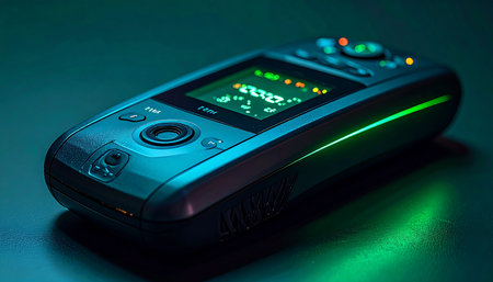 A sleek, futuristic handheld gaming console rests on a reflective surface, its screen and side panels glowing with a cool green and teal light. This image evokes a sense of immersive entertainment, advanced technology, and the exciting world of portable gaming, perfect for themes of innovation, leisure, and cyberpunk aesthetics.