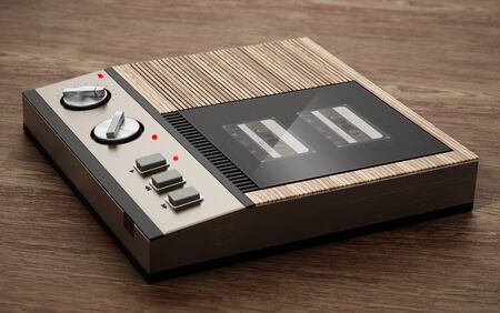 Retro dusty boombox (tape recorder) on a shelf in a garage