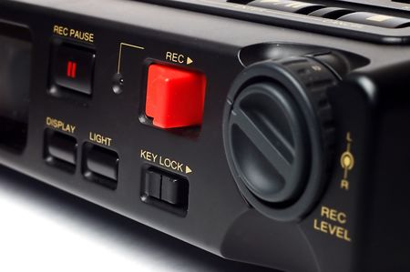 Red REC recording button on a modern pocket audio voice recorder, switch object macro extreme closeup Secretly recording, journalist or reporter equipment, simple live music recording abstract concept