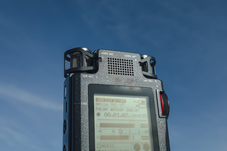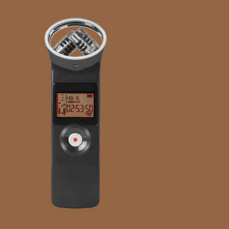 Electronic audio device - Front view Portable digital Recorder isolated on a brown background.