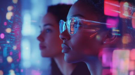 Double exposure of two women with abstract digital circuits. AI and futuristic concept